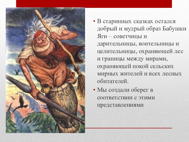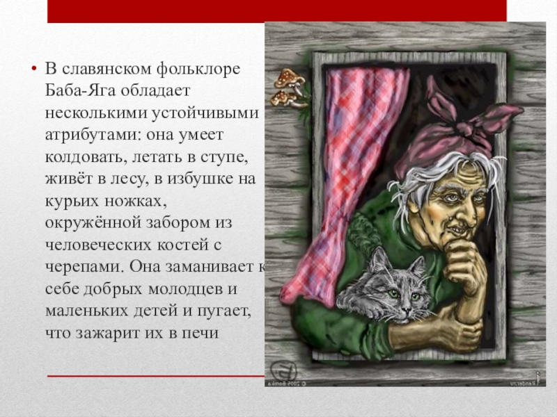 Слайд 17В славянском фольклоре Баба-Яга обладает несколькими устойчивыми атрибутами: она умеет колдовать,
