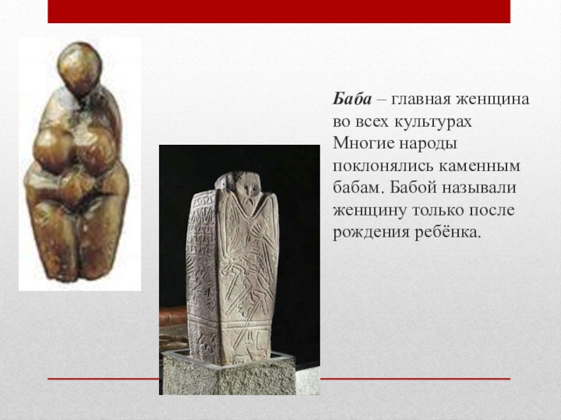 Слайд 13Баба – главная женщина во всех культурах Многие народы поклонялись каменным