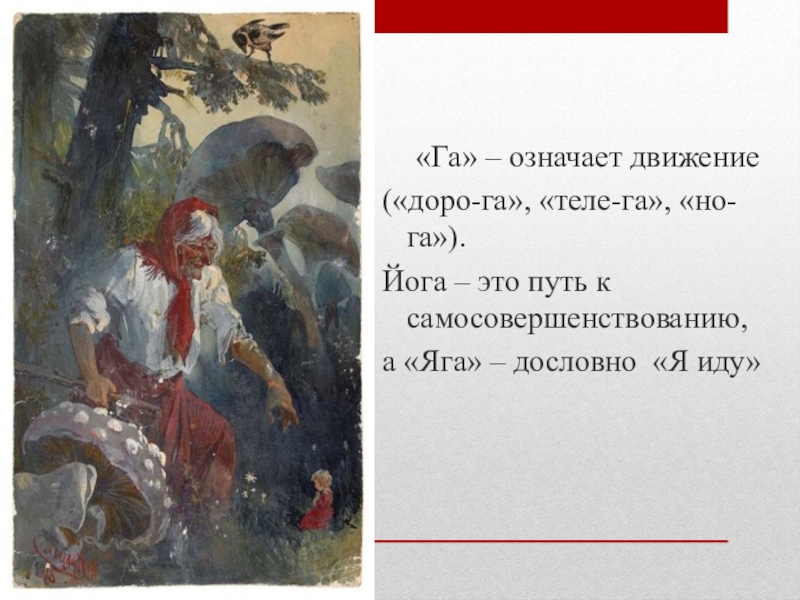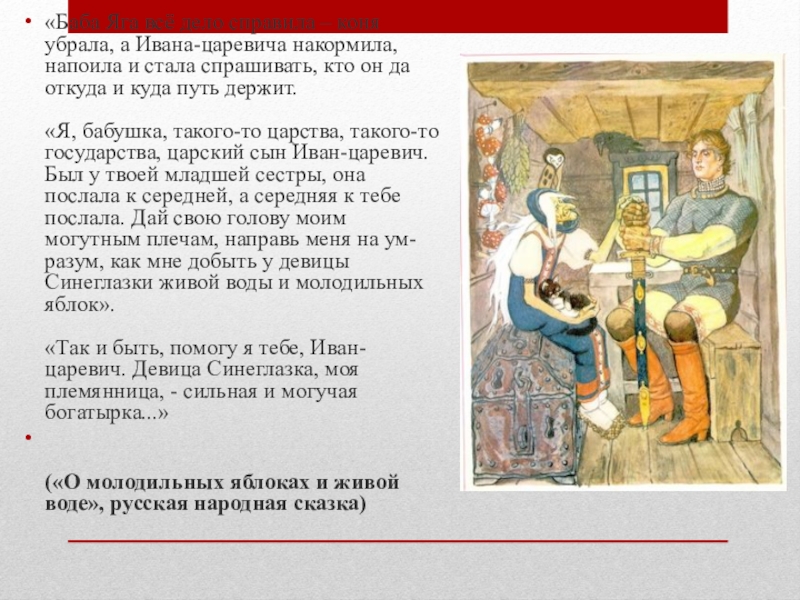 Слайд 21«Баба Яга всё дело справила – коня убрала, а Ивана-царевича накормила,