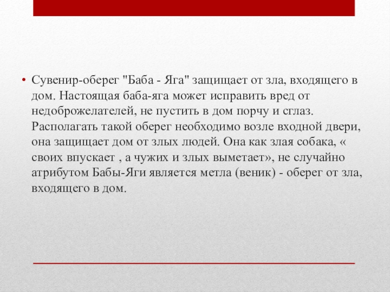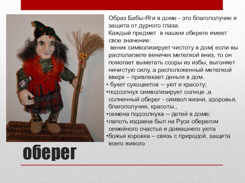 Слайд 25Сувенир-оберег "Баба - Яга" защищает от зла, входящего в дом. Настоящая