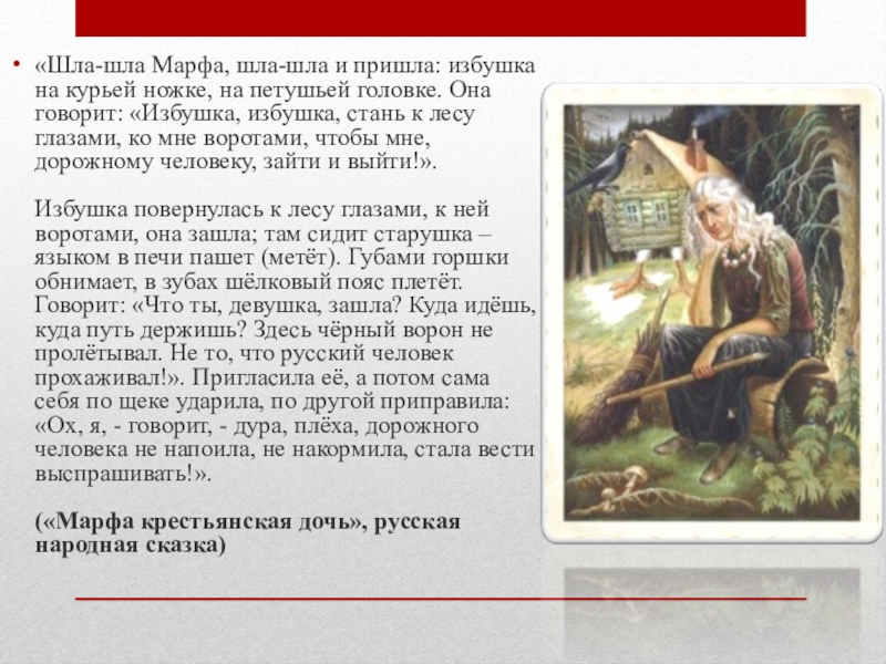 Слайд 20«Шла-шла Марфа, шла-шла и пришла: избушка на курьей ножке, на петушьей