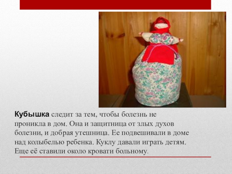 и защитница от злых духов болезни, и добрая утешница. Ее подвешивали в доме над колыбелью ребенка. Куклу давали играть детям. Еще её ставили около кровати больному.