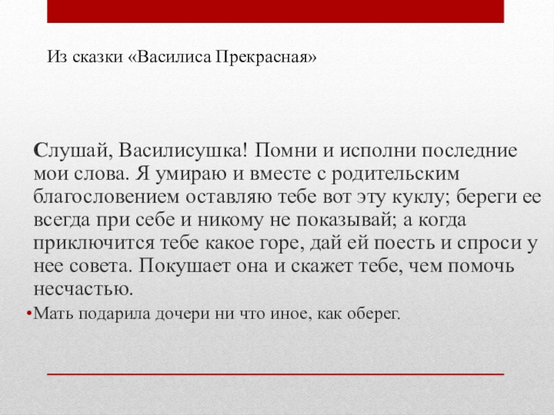 Слайд 4Слушай, Василисушка! Помни и исполни последние мои слова. Я умираю и