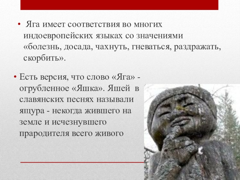 Слайд 15 Яга имеет соответствия во многих индоевропейских языках со значениями «болезнь,