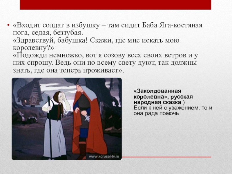 Слайд 19«Входит солдат в избушку – там сидит Баба Яга-костяная нога, седая,
