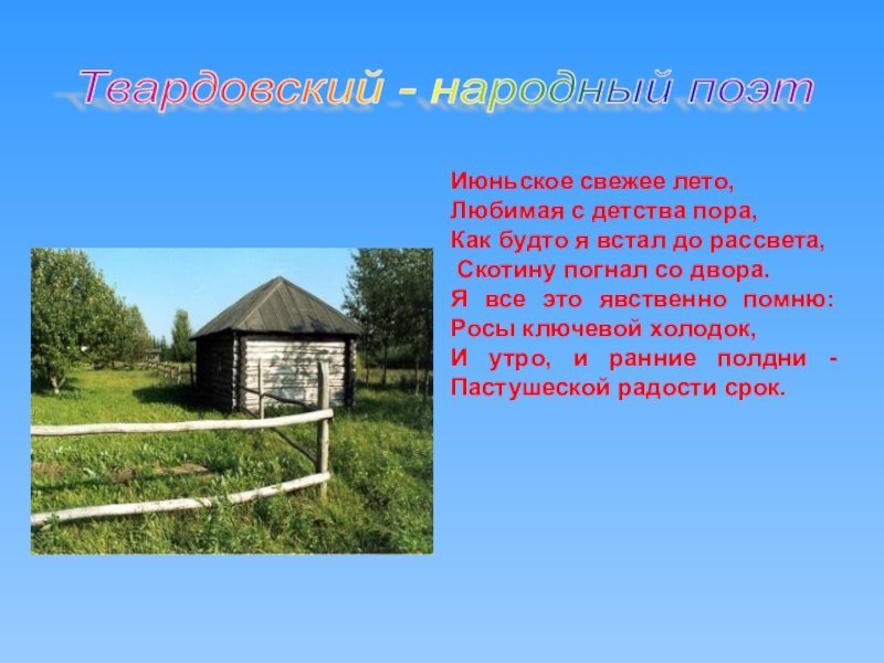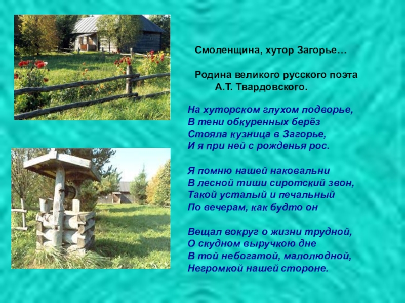 Слайд 2А. Т. Твардовский родился 8 июня 1910 года на хуторе Загорье рядом с деревней Сельцо