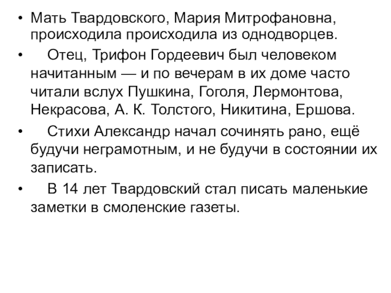 Слайд 4Мать Твардовского, Мария Митрофановна, происходила происходила из однодворцев.