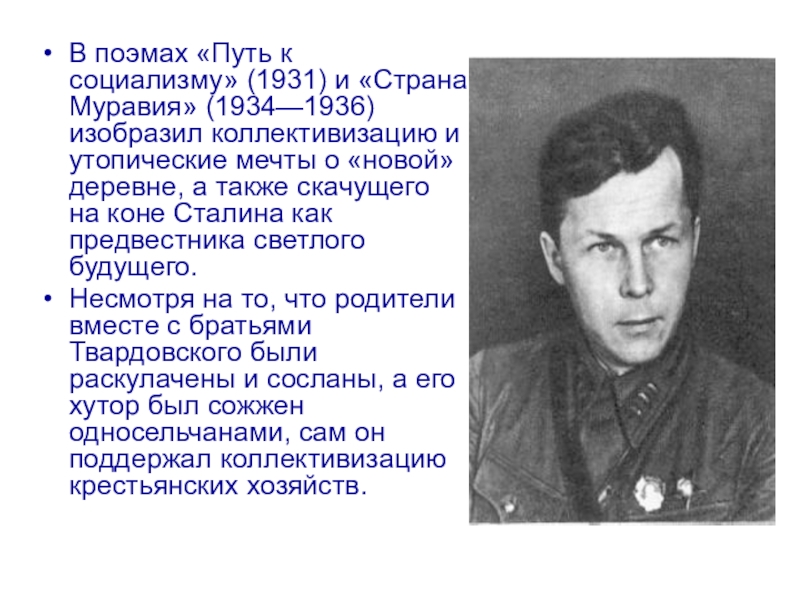 Несмотря на то, что родители вместе с братьями Твардовского были раскулачены и сосланы, а его хутор был сожжен односельчанами, сам он поддержал коллективизацию крестьянских хозяйств.