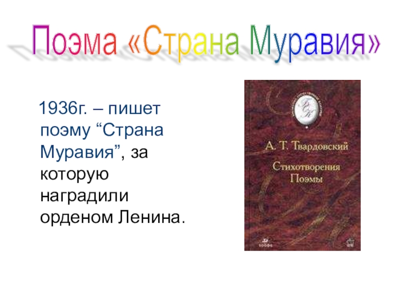 1936г. – пишет поэму “Страна Муравия”, за которую