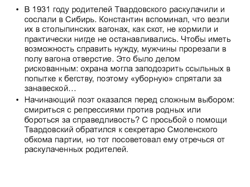 В 1931 году родителей Твардовского раскулачили и сослали в Сибирь. Константин