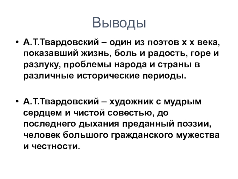 А.Т.Твардовский – художник с мудрым сердцем и чистой совестью, до последнего дыхания преданный поэзии, человек большого гражданского мужества и честности.
