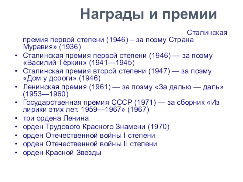 Сталинская премия первой степени (1946) — за поэму «Василий Тёркин» (1941—1945)