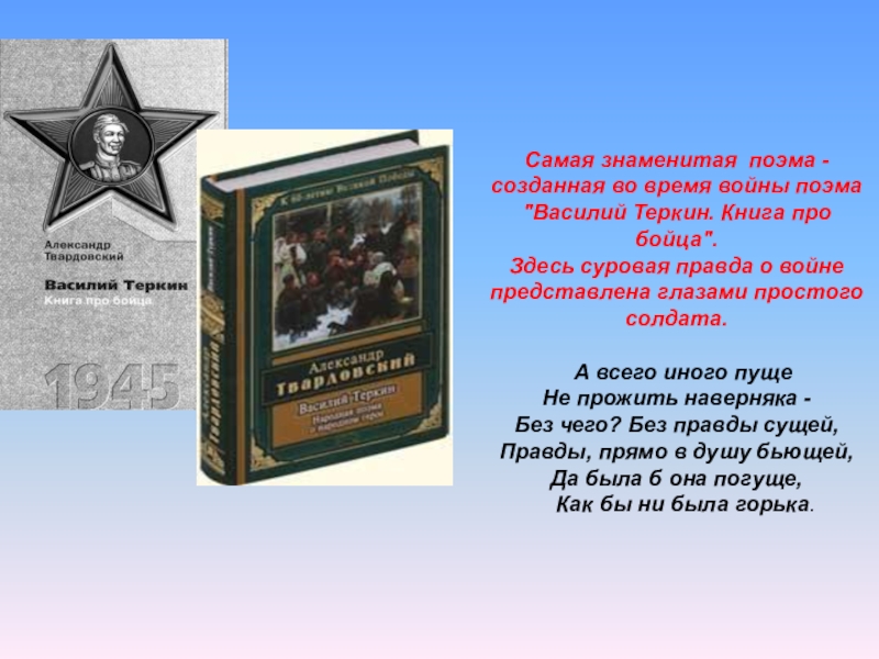 Слайд 21Самая знаменитая поэма - созданная во время войны поэма "Василий Теркин.