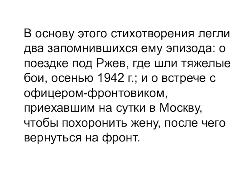 ему эпизода: о поездке под Ржев, где шли тяжелые бои, осенью 1942 г.; и о встрече с офицером-фронтовиком, приехавшим на сутки в Москву, чтобы похоронить жену, после чего вернуться на фронт.