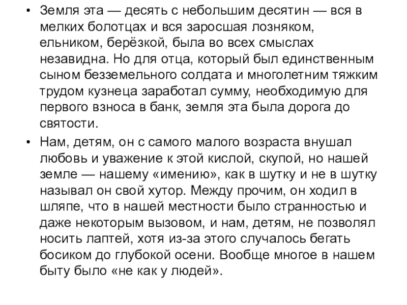 Нам, детям, он с самого малого возраста внушал любовь и уважение к этой кислой, скупой, но нашей земле — нашему «имению», как в шутку и не в шутку называл он свой хутор. Между прочим, он ходил в шляпе, что в нашей местности было странностью и даже некоторым вызовом, и нам, детям, не позволял носить лаптей, хотя из-за этого случалось бегать босиком до глубокой осени. Вообще многое в нашем быту было «не как у людей».