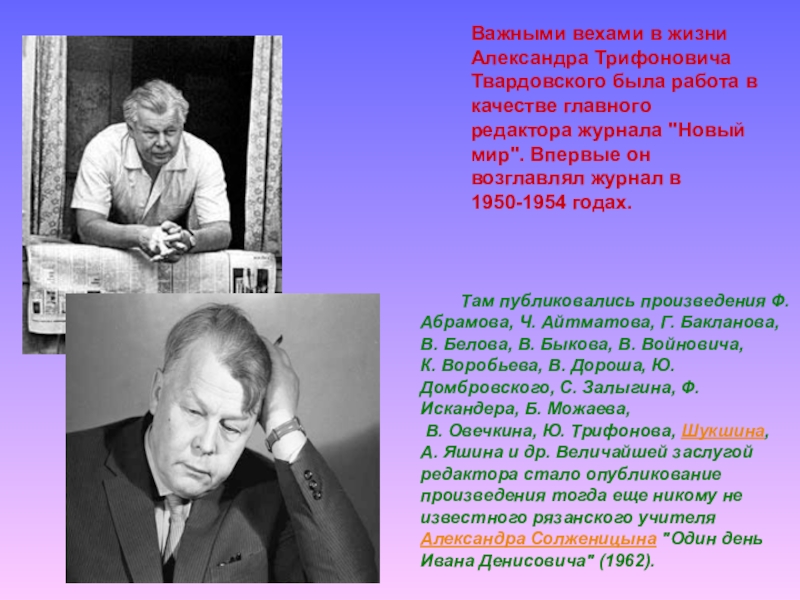 А. Яшина и др. Величайшей заслугой редактора стало опубликование произведения тогда еще никому не известного рязанского учителя Александра Солженицына "Один день Ивана Денисовича" (1962).