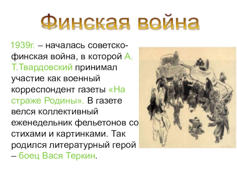 1939г. – началась советско-финская война, в которой А.Т.Твардовский принимал