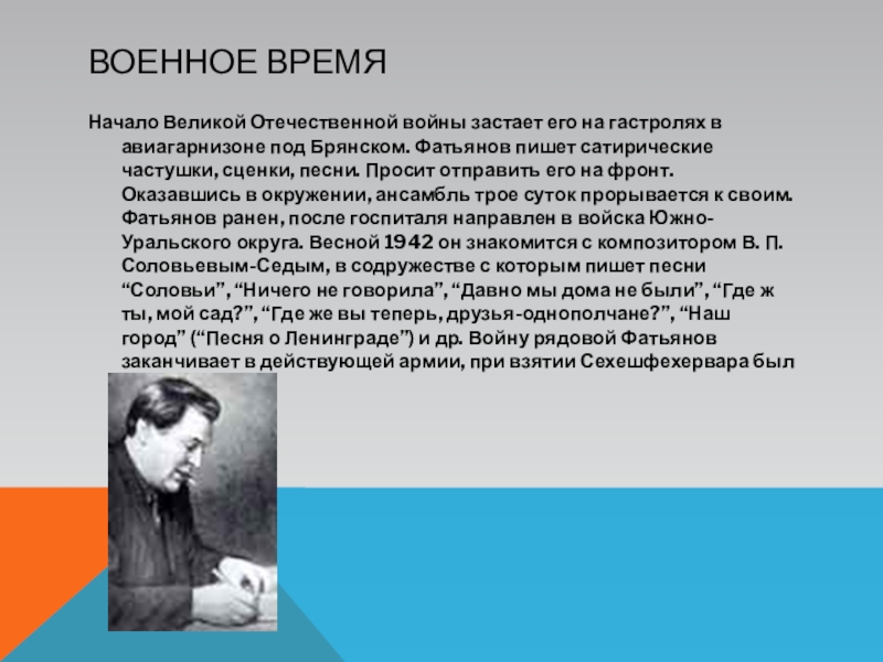 под Брянском. Фатьянов пишет сатирические частушки, сценки, песни. Просит отправить его на фронт. Оказавшись в окружении, ансамбль трое суток прорывается к своим. Фатьянов ранен, после госпиталя направлен в войска Южно-Уральского округа. Весной 1942 он знакомится с композитором В. П. Соловьевым-Седым, в содружестве с которым пишет песни “Соловьи”, “Ничего не говорила”, “Давно мы дома не были”, “Где ж ты, мой сад?”, “Где же вы теперь, друзья-однополчане?”, “Наш город” (“Песня о Ленинграде”) и др. Войну рядовой Фатьянов заканчивает в действующей армии, при взятии Сехешфехервара был ранен.