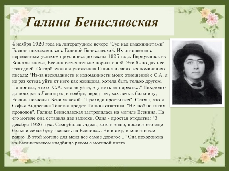 Есенин познакомился с Галиной Бениславской. Их отношения с переменным успехом продлились до весны 1925 года. Вернувшись из Константинова, Есенин окончательно порвал с ней. Это было для нее трагедией. Оскорбленная и униженная Галина в своих воспоминаниях писала: "Из-за нескладности и изломанности моих отношений с С.А. я не раз хотела уйти от него как женщина, хотела быть только другом. Но поняла, что от С.А. мне не уйти, эту нить не порвать..." Незадолго до поездки в Ленинград в ноябре, перед тем, как лечь в больницу, Есенин позвонил Бениславской: "Приходи проститься". Сказал, что и Софья Андреевна Толстая придет. Галина ответила: "Не люблю таких проводов". Галина Бениславская застрелилась на могиле Есенина. На его могиле она оставила две записки. Одна - простая открытка: "3 декабря 1926 года. Самоубилась здесь, хотя и знаю, после этого еще больше собак будут вешать на Есенина... Но и ему, и мне это все равно. В этой могиле для меня все самое дорогое..." Она похоронена на Ваганьковском кладбище рядом с могилой поэта.