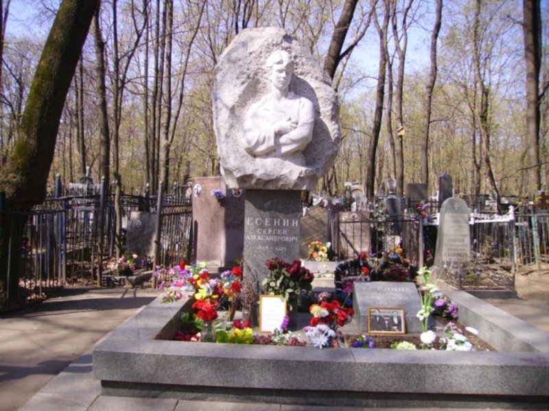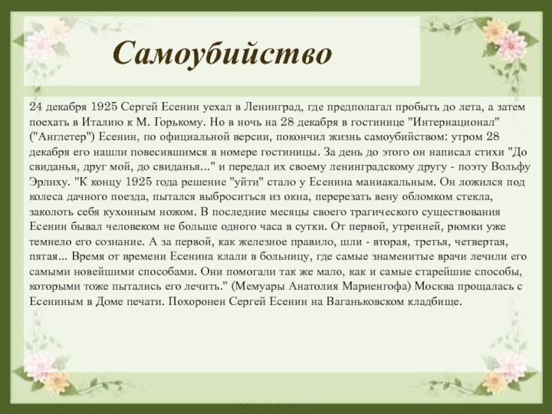 до лета, а затем поехать в Италию к М. Горькому. Но в ночь на 28 декабря в гостинице "Интернационал" ("Англетер") Есенин, по официальной версии, покончил жизнь самоубийством: утром 28 декабря его нашли повесившимся в номере гостиницы. За день до этого он написал стихи "До свиданья, друг мой, до свиданья..." и передал их своему ленинградскому другу - поэту Вольфу Эрлиху. "К концу 1925 года решение "уйти" стало у Есенина маниакальным. Он ложился под колеса дачного поезда, пытался выброситься из окна, перерезать вену обломком стекла, заколоть себя кухонным ножом. В последние месяцы своего трагического существования Есенин бывал человеком не больше одного часа в сутки. От первой, утренней, рюмки уже темнело его сознание. А за первой, как железное правило, шли - вторая, третья, четвертая, пятая... Время от времени Есенина клали в больницу, где самые знаменитые врачи лечили его самыми новейшими способами. Они помогали так же мало, как и самые старейшие способы, которыми тоже пытались его лечить." (Мемуары Анатолия Мариенгофа) Москва прощалась с Есениным в Доме печати. Похоронен Сергей Есенин на Ваганьковском кладбище.