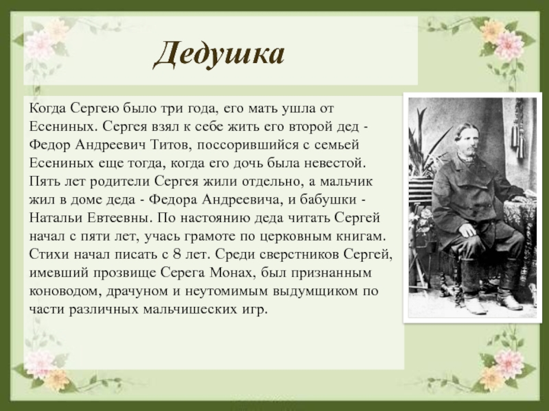 взял к себе жить его второй дед - Федор Андреевич Титов, поссорившийся с семьей Есениных еще тогда, когда его дочь была невестой. Пять лет родители Сергея жили отдельно, а мальчик жил в доме деда - Федора Андреевича, и бабушки - Натальи Евтеевны. По настоянию деда читать Сергей начал с пяти лет, учась грамоте по церковным книгам. Стихи начал писать с 8 лет. Среди сверстников Сергей, имевший прозвище Серега Монах, был признанным коноводом, драчуном и неутомимым выдумщиком по части различных мальчишеских игр.