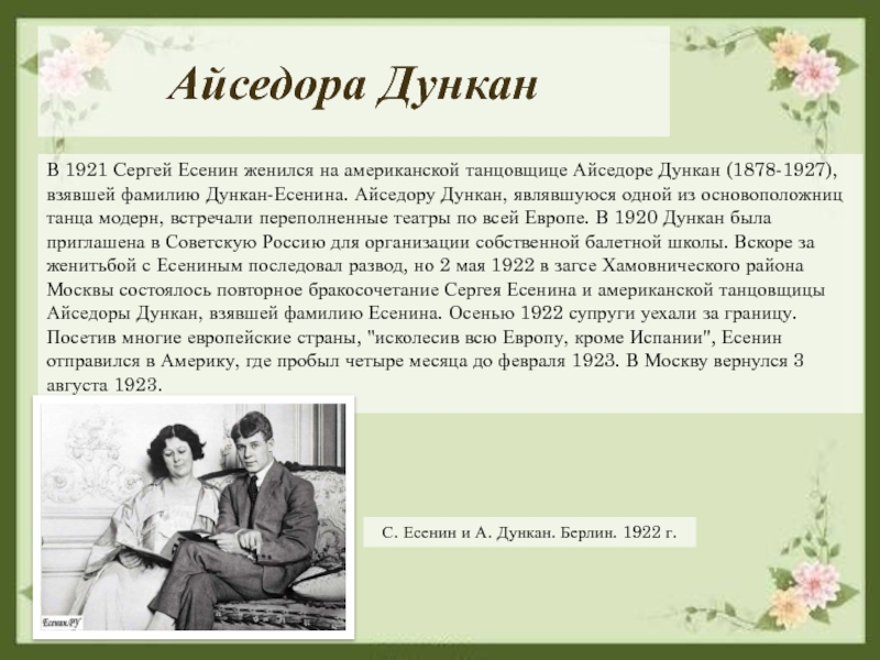 (1878-1927), взявшей фамилию Дункан-Есенина. Айседору Дункан, являвшуюся одной из основоположниц танца модерн, встречали переполненные театры по всей Европе. В 1920 Дункан была приглашена в Советскую Россию для организации собственной балетной школы. Вскоре за женитьбой с Есениным последовал развод, но 2 мая 1922 в загсе Хамовнического района Москвы состоялось повторное бракосочетание Сергея Есенина и американской танцовщицы Айседоры Дункан, взявшей фамилию Есенина. Осенью 1922 супруги уехали за границу. Посетив многие европейские страны, "исколесив всю Европу, кроме Испании", Есенин отправился в Америку, где пробыл четыре месяца до февраля 1923. В Москву вернулся 3 августа 1923.