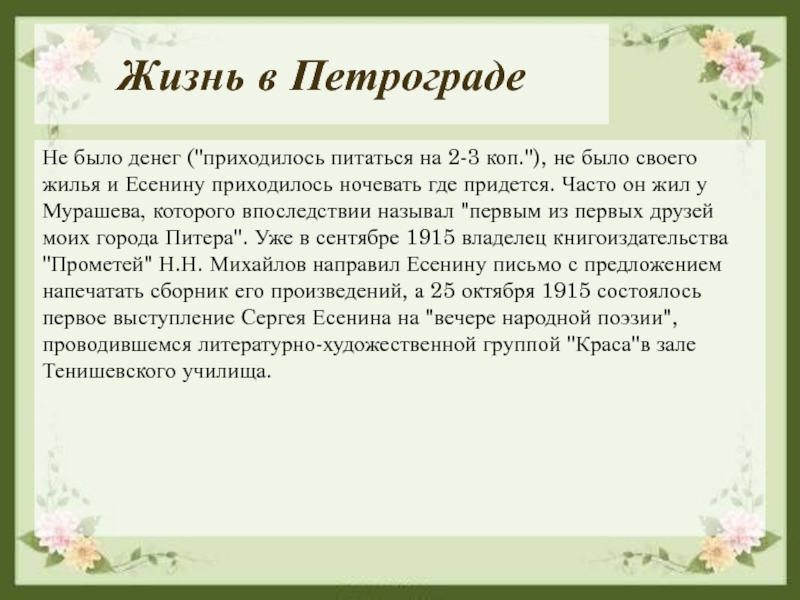 было своего жилья и Есенину приходилось ночевать где придется. Часто он жил у Мурашева, которого впоследствии называл "первым из первых друзей моих города Питера". Уже в сентябре 1915 владелец книгоиздательства "Прометей" Н.Н. Михайлов направил Есенину письмо с предложением напечатать сборник его произведений, а 25 октября 1915 состоялось первое выступление Сергея Есенина на "вечере народной поэзии", проводившемся литературно-художественной группой "Краса"в зале Тенишевского училища.