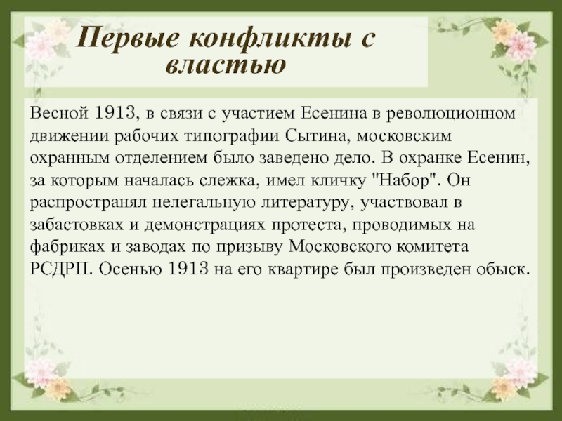 революционном движении рабочих типографии Сытина, московским охранным отделением было заведено дело. В охранке Есенин, за которым началась слежка, имел кличку "Набор". Он распространял нелегальную литературу, участвовал в забастовках и демонстрациях протеста, проводимых на фабриках и заводах по призыву Московского комитета РСДРП. Осенью 1913 на его квартире был произведен обыск.