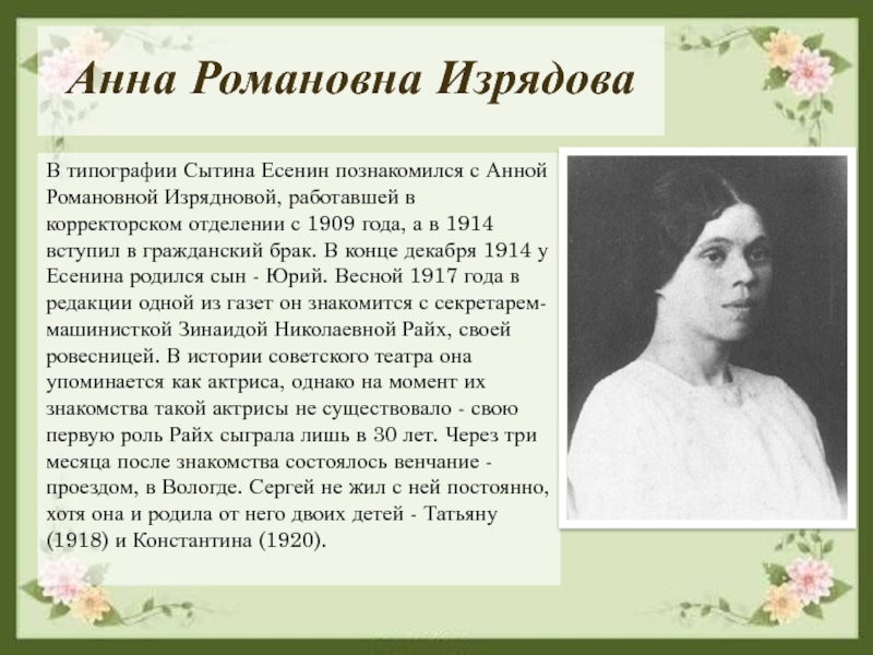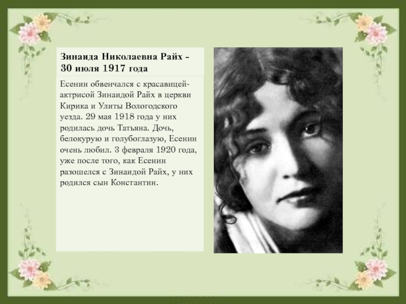 работавшей в корректорском отделении с 1909 года, а в 1914 вступил в гражданский брак. В конце декабря 1914 у Есенина родился сын - Юрий. Весной 1917 года в редакции одной из газет он знакомится с секретарем-машинисткой Зинаидой Николаевной Райх, своей ровесницей. В истории советского театра она упоминается как актриса, однако на момент их знакомства такой актрисы не существовало - свою первую роль Райх сыграла лишь в 30 лет. Через три месяца после знакомства состоялось венчание - проездом, в Вологде. Сергей не жил с ней постоянно, хотя она и родила от него двоих детей - Татьяну (1918) и Константина (1920).