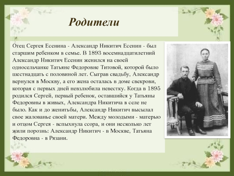 в семье. В 1893 восемнадцатилетний Александр Никитич Есенин женился на своей односельчанке Татьяне Федоровне Титовой, которой было шестнадцать с половиной лет. Сыграв свадьбу, Александр вернулся в Москву, а его жена осталась в доме свекрови, которая с первых дней невзлюбила невестку. Когда в 1895 родился Сергей, первый ребенок, оставшийся у Татьяны Федоровны в живых, Александра Никитича в селе не было. Как и до женитьбы, Александр Никитич высылал свое жалованье своей матери. Между молодыми - матерью и отцом Сергея - вспыхнула ссора, и они несколько лет жили порознь: Александр Никитич - в Москве, Татьяна Федоровна - в Рязани.