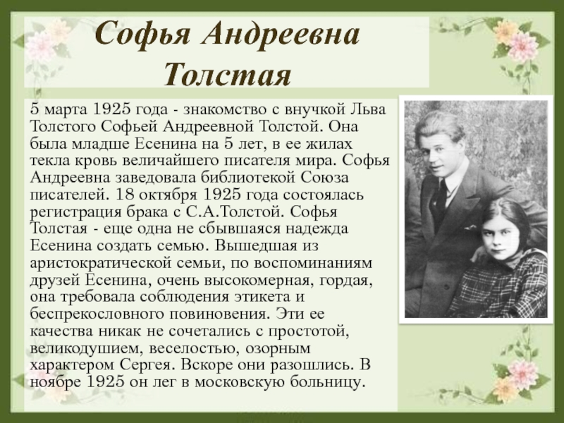 Толстого Софьей Андреевной Толстой. Она была младше Есенина на 5 лет, в ее жилах текла кровь величайшего писателя мира. Софья Андреевна заведовала библиотекой Союза писателей. 18 октября 1925 года состоялась регистрация брака с С.А.Толстой. Софья Толстая - еще одна не сбывшаяся надежда Есенина создать семью. Вышедшая из аристократической семьи, по воспоминаниям друзей Есенина, очень высокомерная, гордая, она требовала соблюдения этикета и беспрекословного повиновения. Эти ее качества никак не сочетались с простотой, великодушием, веселостью, озорным характером Сергея. Вскоре они разошлись. В ноябре 1925 он лег в московскую больницу.