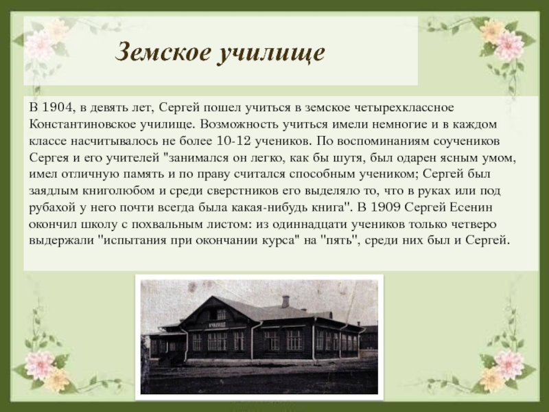 четырехклассное Константиновское училище. Возможность учиться имели немногие и в каждом классе насчитывалось не более 10-12 учеников. По воспоминаниям соучеников Сергея и его учителей "занимался он легко, как бы шутя, был одарен ясным умом, имел отличную память и по праву считался способным учеником; Сергей был заядлым книголюбом и среди сверстников его выделяло то, что в руках или под рубахой у него почти всегда была какая-нибудь книга". В 1909 Сергей Есенин окончил школу с похвальным листом: из одиннадцати учеников только четверо выдержали "испытания при окончании курса" на "пять", среди них был и Сергей.