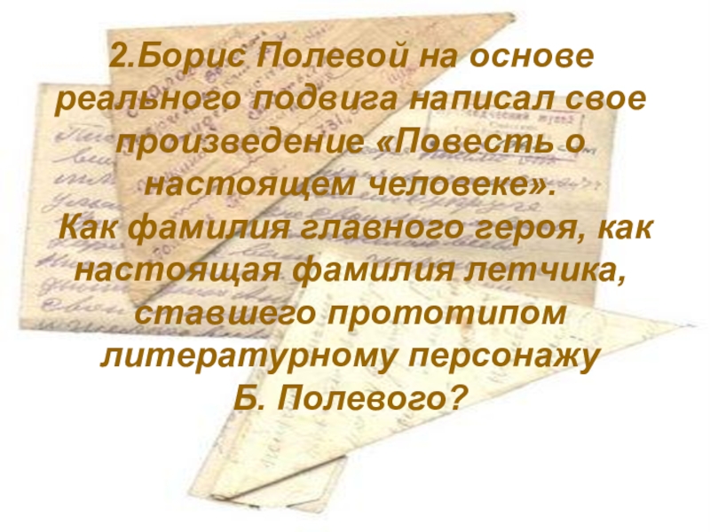 2.Борис Полевой на основе реального подвига написал свое произведение «Повесть о