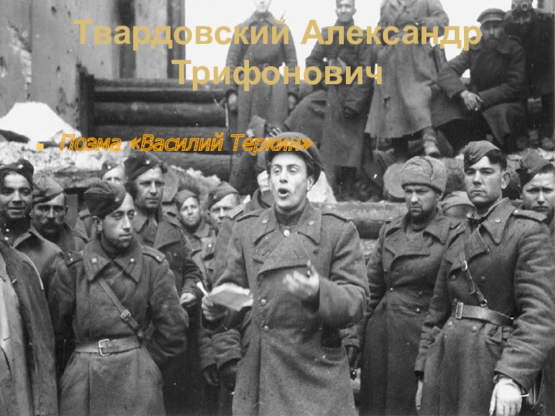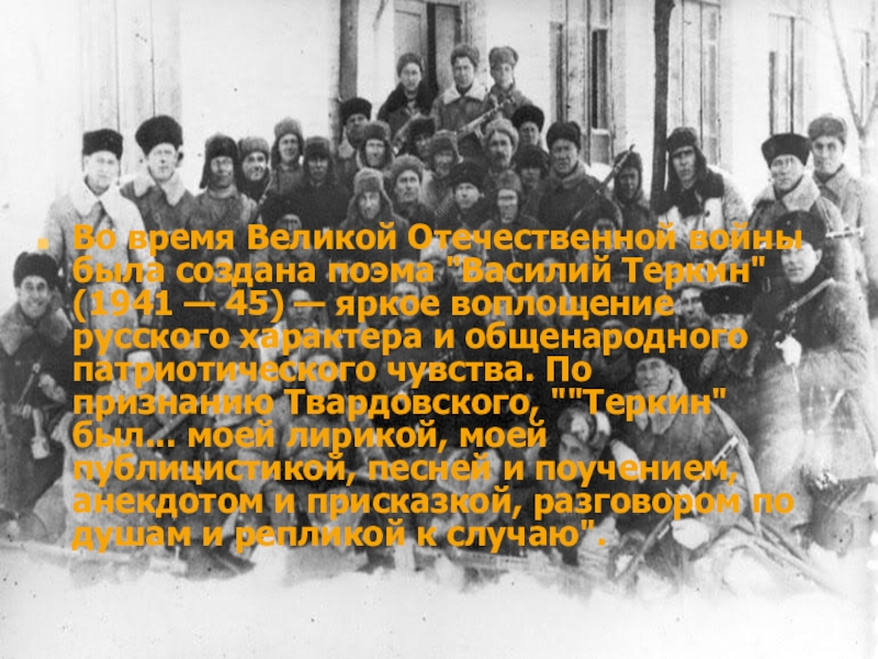 — 45) — яркое воплощение русского характера и общенародного патриотического чувства. По признанию Твардовского, ""Теркин" был... моей лирикой, моей публицистикой, песней и поучением, анекдотом и присказкой, разговором по душам и репликой к случаю".