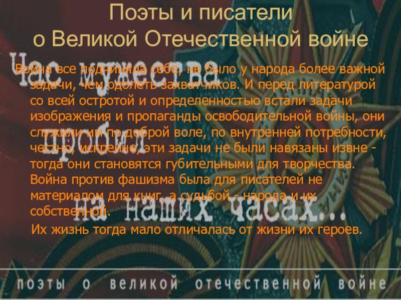 было у народа более важной задачи, чем одолеть захватчиков. И перед литературой со всей остротой и определенностью встали задачи изображения и пропаганды освободительной войны, они служили им по доброй воле, по внутренней потребности, честно, искренне, эти задачи не были навязаны извне - тогда они становятся губительными для творчества. Война против фашизма была для писателей не материалом для книг, а судьбой - народа и их собственной.
