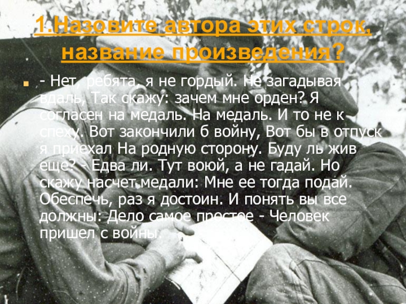 гордый. Не загадывая вдаль, Так скажу: зачем мне орден? Я согласен на медаль. На медаль. И то не к спеху. Вот закончили б войну, Вот бы в отпуск я приехал На родную сторону. Буду ль жив еще? - Едва ли. Тут воюй, а не гадай. Но скажу насчет медали: Мне ее тогда подай. Обеспечь, раз я достоин. И понять вы все должны: Дело самое простое - Человек пришел с войны.
