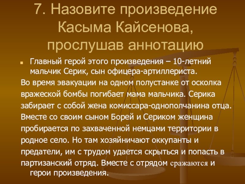 Слайд 187. Назовите произведение Касыма Кайсенова, прослушав аннотацию