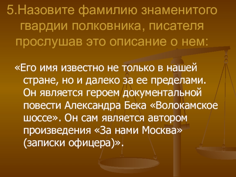 Слайд 135.Назовите фамилию знаменитого гвардии полковника, писателя прослушав это описание о нем:
