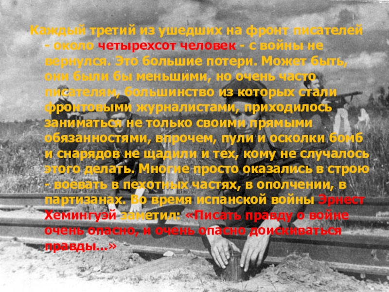 - с войны не вернулся. Это большие потери. Может быть, они были бы меньшими, но очень часто писателям, большинство из которых стали фронтовыми журналистами, приходилось заниматься не только своими прямыми обязанностями, впрочем, пули и осколки бомб и снарядов не щадили и тех, кому не случалось этого делать. Многие просто оказались в строю - воевать в пехотных частях, в ополчении, в партизанах. Во время испанской войны Эрнест Хемингуэй заметил: «Писать правду о войне очень опасно, и очень опасно доискиваться правды...»