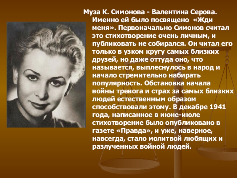 Муза К. Симонова - Валентина Серова. Именно ей было посвящено «Жди