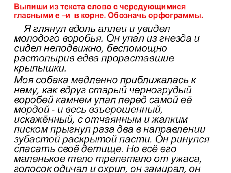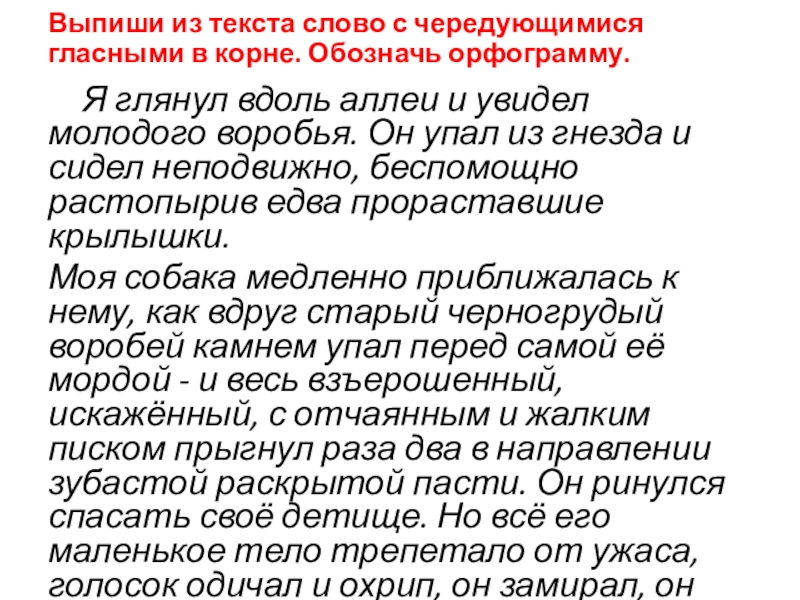 Моя собака медленно приближалась к нему, как вдруг старый черногрудый воробей камнем упал перед самой её мордой - и весь взъерошенный, искажённый, с отчаянным и жалким писком прыгнул раза два в направлении зубастой раскрытой пасти. Он ринулся спасать своё детище. Но всё его маленькое тело трепетало от ужаса, голосок одичал и охрип, он замирал, он жертвовал собою. (По И. Тургеневу)