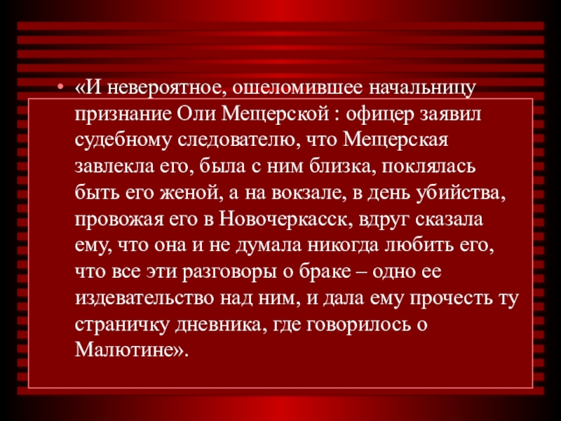 Слайд 20«И невероятное, ошеломившее начальницу признание Оли Мещерской : офицер заявил судебному