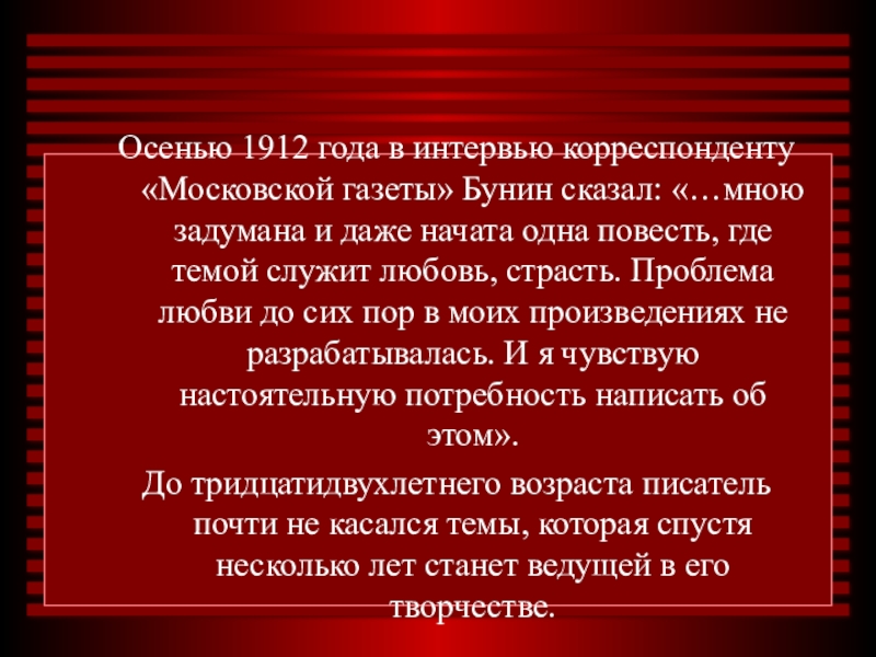 Слайд 3Осенью 1912 года в интервью корреспонденту «Московской газеты» Бунин сказал: «…мною