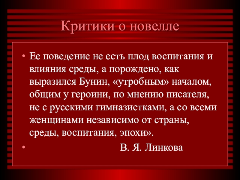 а порождено, как выразился Бунин, «утробным» началом, общим у героини, по мнению писателя, не с русскими гимназистками, а со всеми женщинами независимо от страны, среды, воспитания, эпохи».