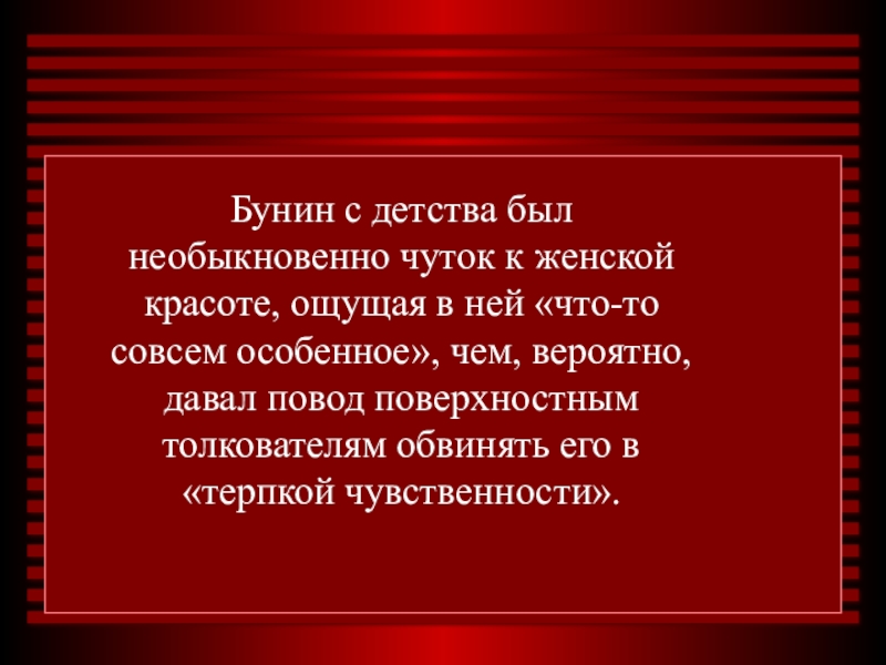 Слайд 4Бунин с детства был необыкновенно чуток к женской красоте, ощущая в