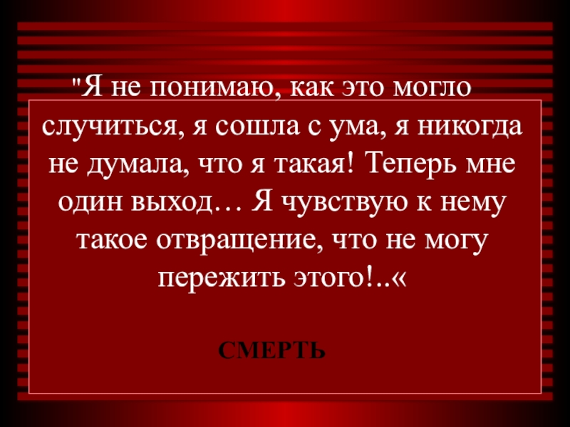 я никогда не думала, что я такая! Теперь мне один выход… Я чувствую к нему такое отвращение, что не могу пережить этого!..«