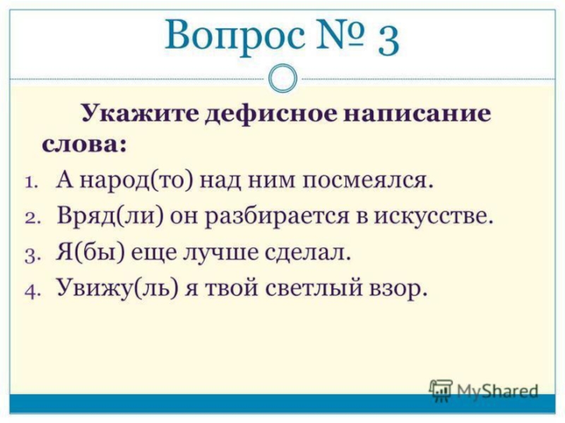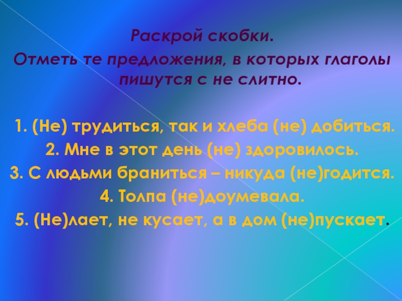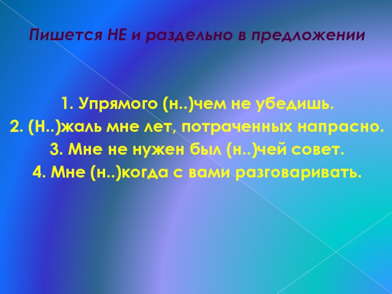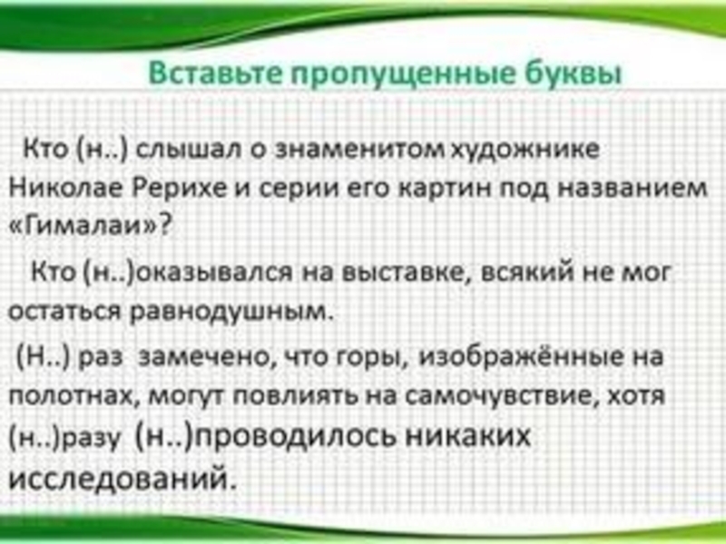 в этом. 2. (Не)други моего друга — мои (не)други. 3. (Не)удача, а трудности ждали его в работе. 4. Мы скрылись в шалаше от (не)погоды. 5. Ребята мечтают о (не)обжитых местах, о(не)изведанных тайнах. 6. Отец (не)(до)смотрел за ребенком. 7. Ты как будто (не)рад мне? 8. (Не) достать мне этой редкой книги! 9. Урал — край (не)сметных богатств. 10. Издали слышался шум (не)угомонного ручья. 11. Никак (не)потревоженный снег лежит волнистыми сугробами.