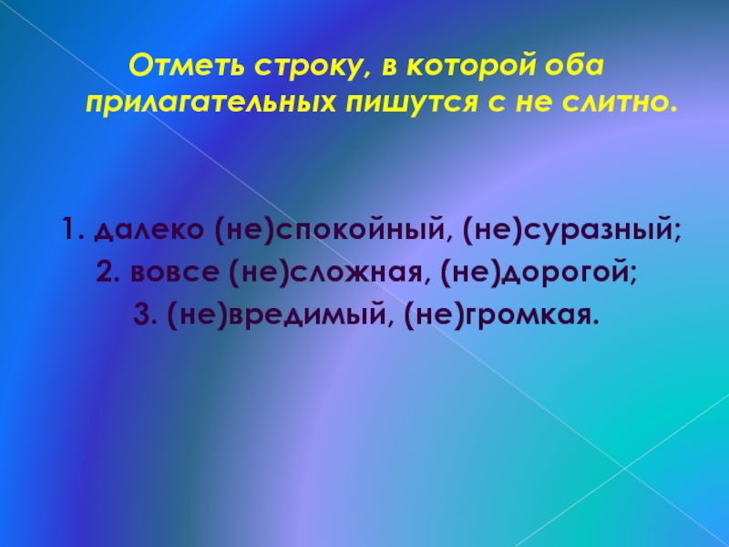 Слайд 264Отметь строку, в которой все слова пишутся с не раздельно.