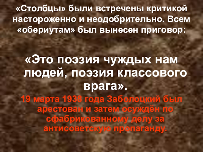 19 марта 1938 года Заболоцкий был арестован и затем осуждён по сфабрикованному делу за антисоветскую пропаганду.