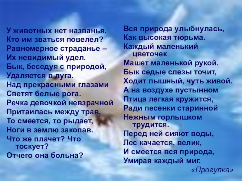 Прямые лысые мужья Сидят, как выстрел из ружья, Едва вытягивая шеи Сквозь мяса жирные траншеи. И, пробиваясь сквозь хрусталь Многообразно однозвучный, Как сон земли благополучной, Парит на крылышках мораль. («Свадьба)
